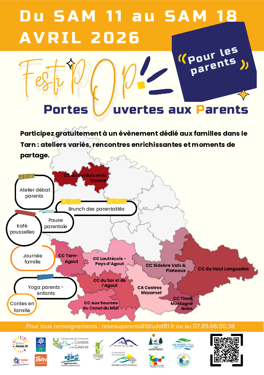 Un évènement dédié aux familles ! Participez gratuitement à un évènement dédié aux familles dans lesud du Tarn : ateliers variés, rencontres enrichissantes et momentsde partage. Avec le soutien de la CAF du Tarn, du département du Tarn et de l'Union Départementale des...