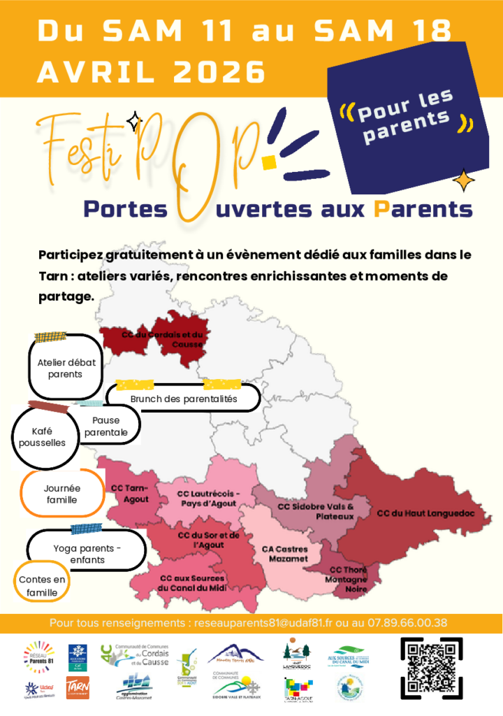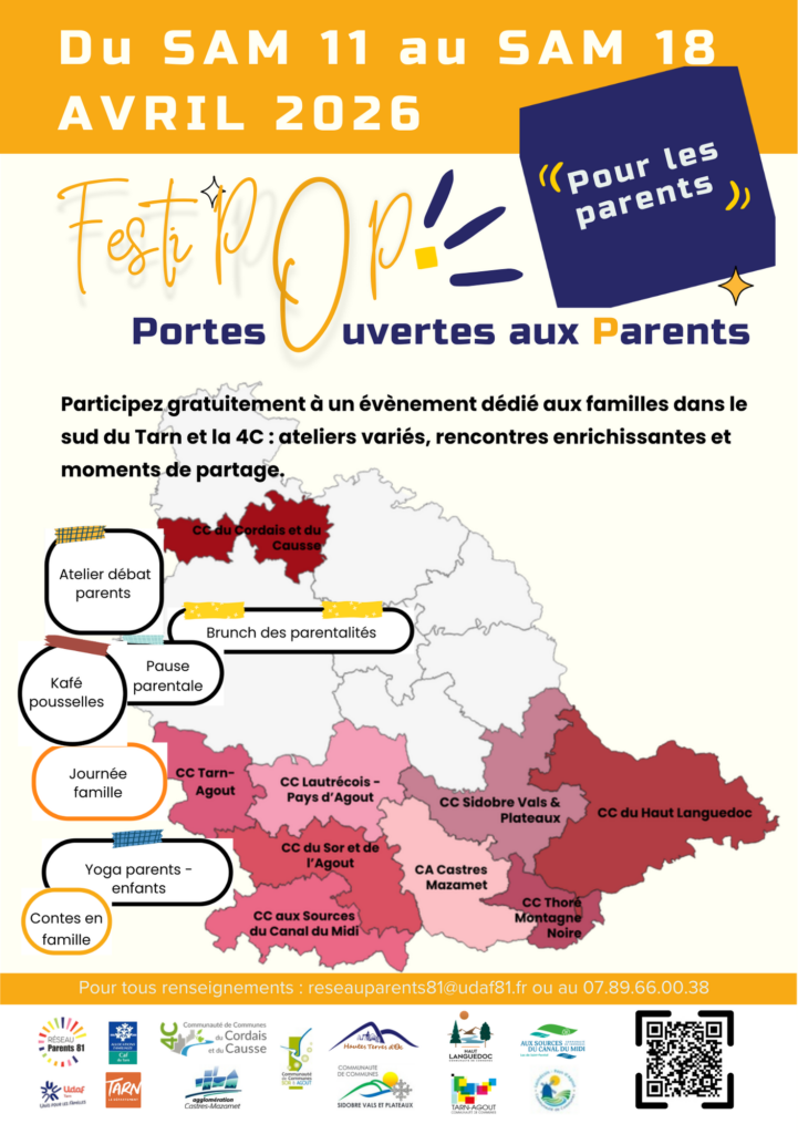 Avec le soutien de la CAF du Tarn, du département du Tarn et de l’Union Départementale des Associations Familiales, un large réseau d’acteurs engagés dans le soutien aux parents organise la seconde édition du FESTI POP.